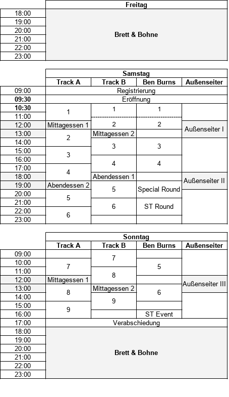 Der Zeitplan ist so angelegt, dass du jederzeit nahtlos vom Spielen in Vorträge und zum Mittagessen und zurück wechseln kannst. Damit du nicht nach einem freien Platz suchen musst, wird es eine Vorregistrierung für die Runden geben – dazu kommt noch eine weitere Mail. Die Runden mit Ben finden auf Wunsch von Ben in Vollbesetzung mit 20 Spielenden statt – das wird auf jeden Fall ein Erlebnis! Da Außenseiter-Tickets ohne Essen sind, gibt es Im Außenseiter-Track 3 Runden jeweils parallel zu den Essenszeiten.